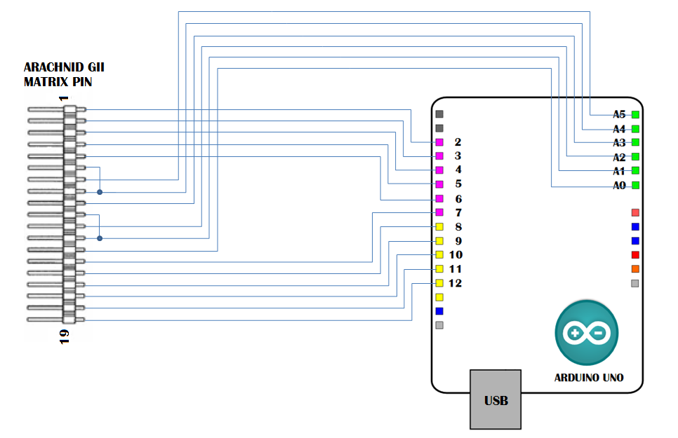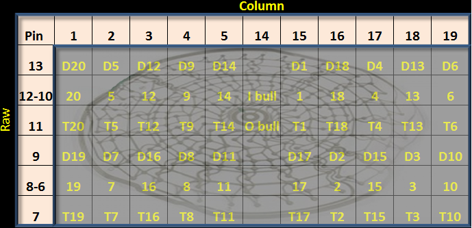 Raw of the dart matrix are connected directly to Arduino A0 to A5 and Column are connected to digital input/output 2 to 12 - Especially for Arachnid galaxy dartboard, pin 6 with 8 and pin 10 with 12 are shunted.